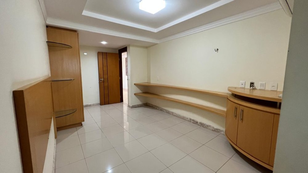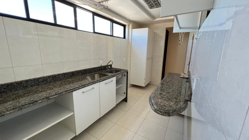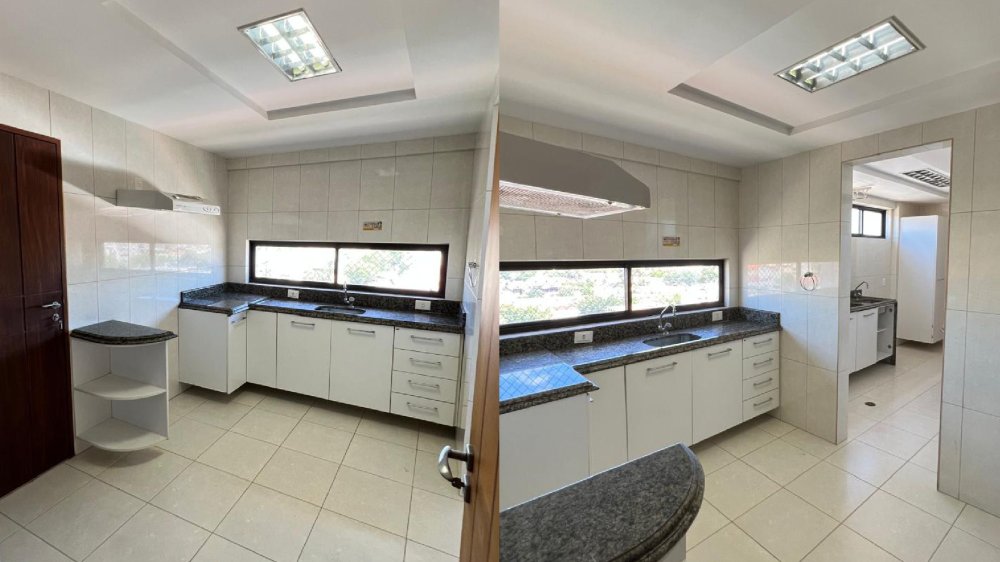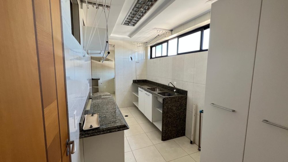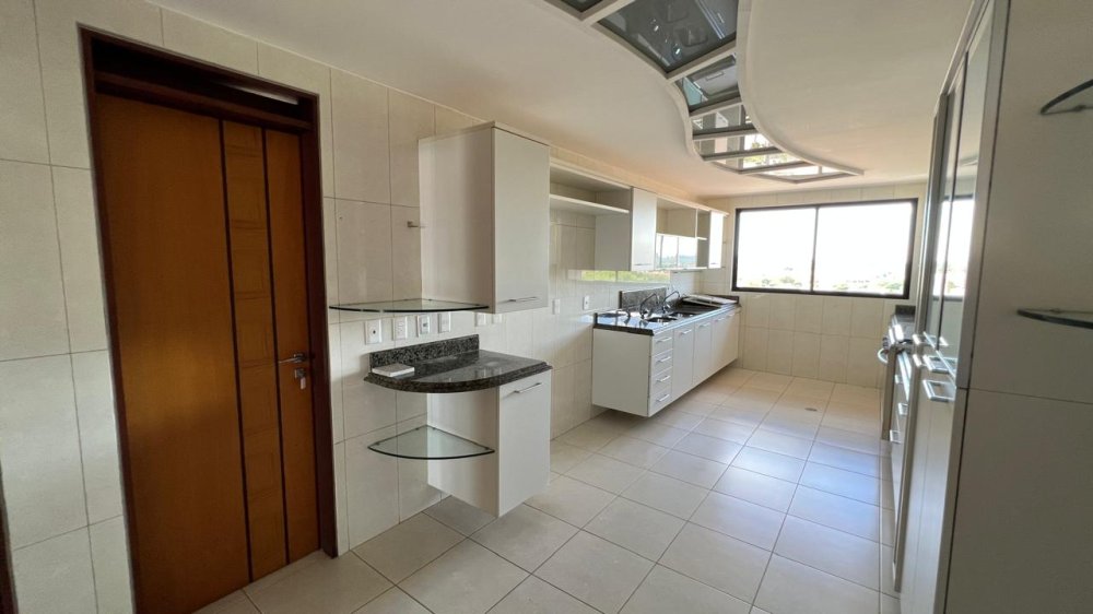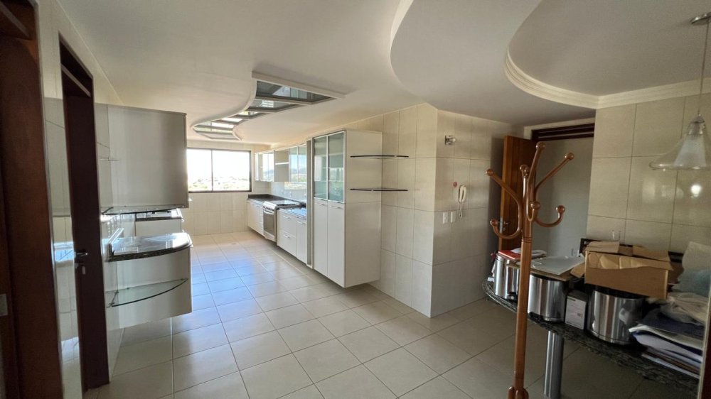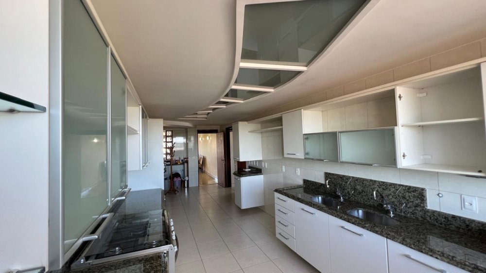 A cozinha é um espetáculo à parte: ampla, funcional e ricamente equipada com móveis planejados, bancada e mesa em granito, com acesso direto à sala e à área íntima. Em anexo, um espaço integrado composto por copa, lavanderia, despensa, banheiro social, depósito e dependência completa de empregada, todos com armários planejados e soluções práticas para o dia a dia.