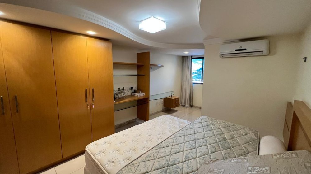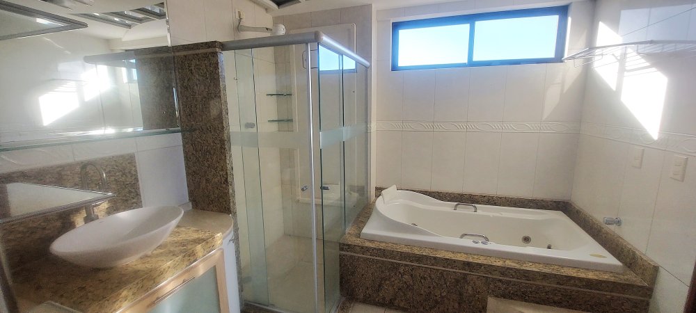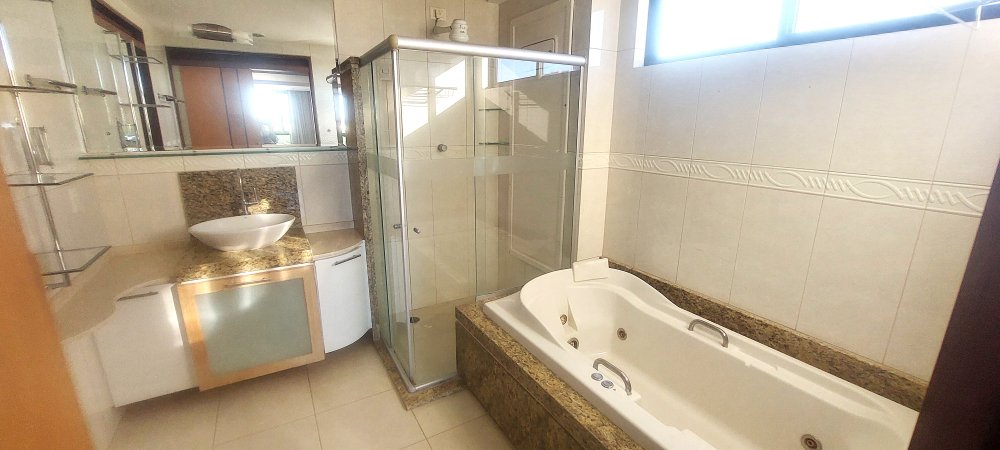 A suíte master é um verdadeiro refúgio, composta por um amplo espaço, closet com roupeiro embutido, banheiro com banheira de hidromassagem e chuveiro com box de vidro, além de acesso interno exclusivo à terceira suíte.