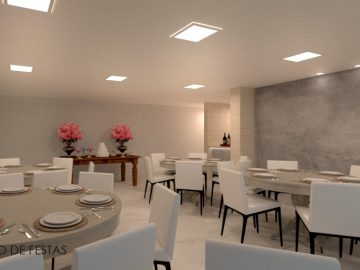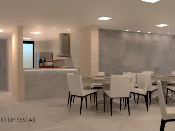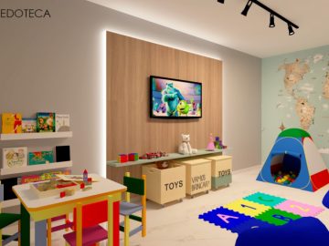 O pavimento térreo foi planejado para oferecer praticidade e lazer completo, reunindo recepção, portaria com apoio, hall de circulação e uma ampla área de convivência com playground e mini quadra em grama sintética, espaço kids, academia equipada, salão de festas, área gourmet integrada ao deck e piscina, além de áreas técnicas e três vagas de garagem cobertas adicionais.