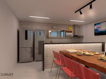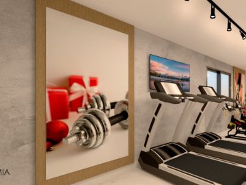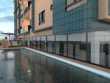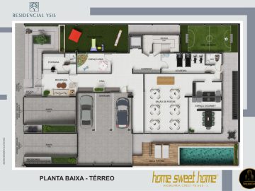 O pavimento térreo foi planejado para oferecer praticidade e lazer completo, reunindo recepção, portaria com apoio, hall de circulação e uma ampla área de convivência com playground e mini quadra em grama sintética, espaço kids, academia equipada, salão de festas, área gourmet integrada ao deck e piscina, além de áreas técnicas e três vagas de garagem cobertas adicionais.
