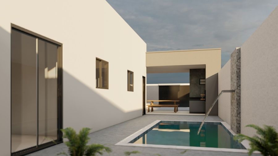 Na área externa, o projeto prevê uma piscina privativa, integrada ao espaço gourmet, criando um ambiente ideal para relaxar, aproveitar os dias de sol e valorizar ainda mais o imóvel.