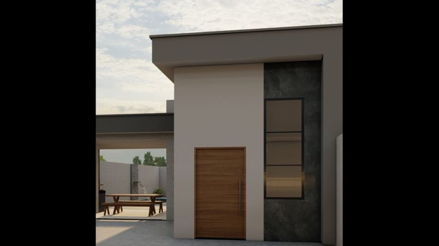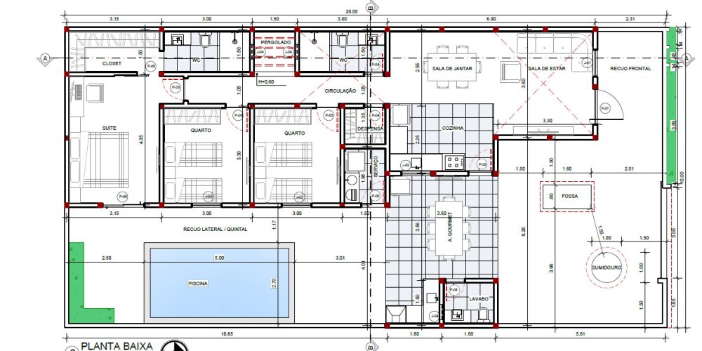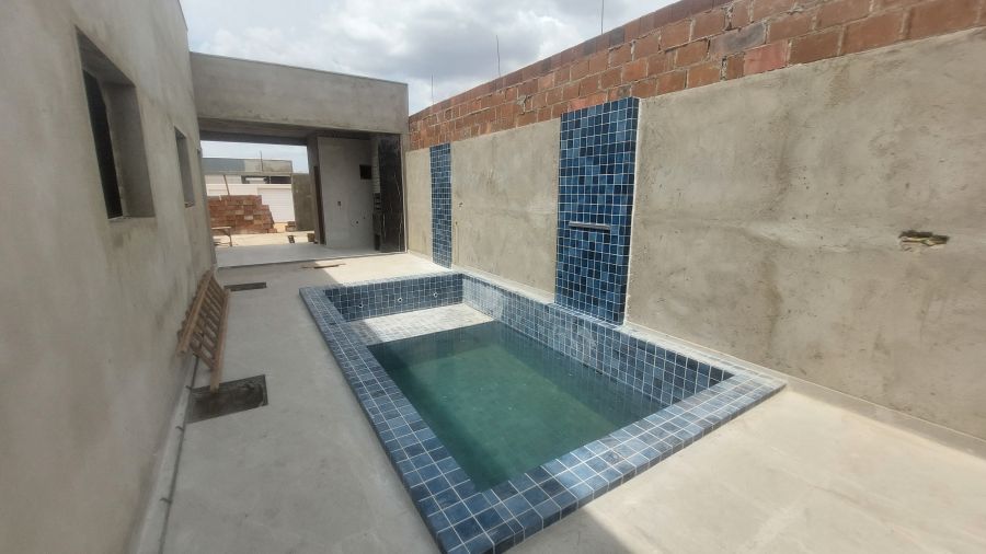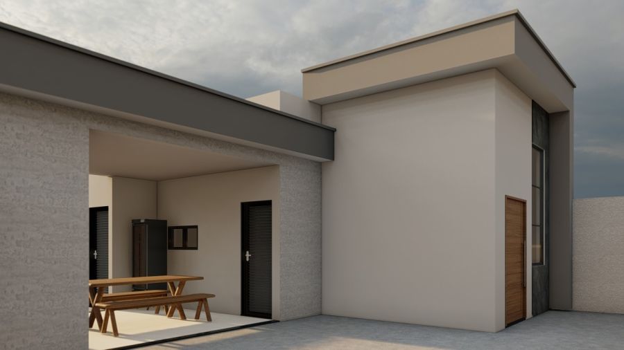 Com padrão construtivo sólido, o projeto prevê paredes em alvenaria, esquadrias em alumínio e madeira e cobertura em telha de fibrocimento, além de sistema de esgotamento sanitário individual com fossa séptica e sumidouro, atendendo às normas técnicas vigentes.