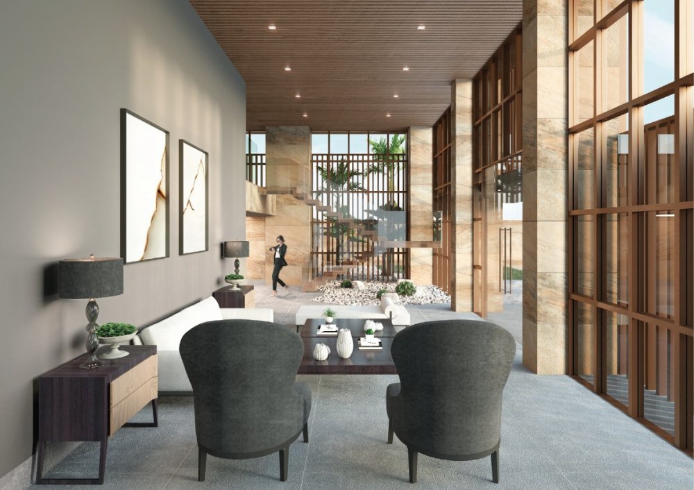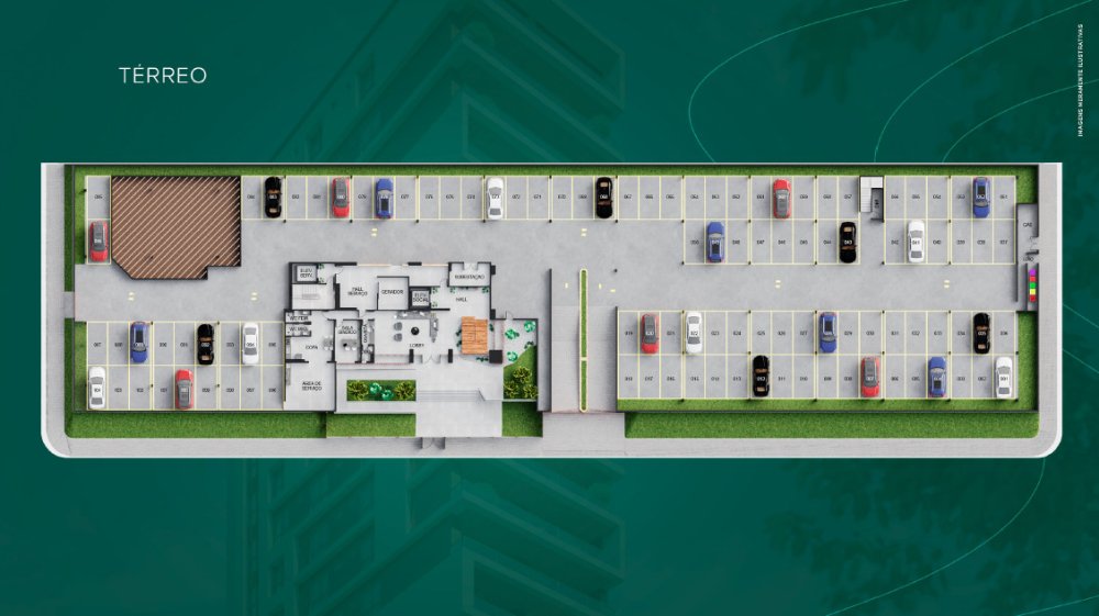 O pavimento térreo possui um estacionamento coberto com capacidade para 106 carros, sendo 04 vagas para cada apartamento, e 06 vagas de garagem para uso comum livres. Também possui área de serviço, copa para funcionários, banheiro masculino e feminino para funcionários, sala para o síndico, guarita com WC, área de circulação, hall social com pé direito duplo e devidamente mobiliado e ambientado com um projeto ultramoderno de uma arquitetura especializada, 03 escadas de acesso ao Mezanino 01, elevador serviço, antecâmara, hall de serviço, gerador, elevador social, hall de elevador, subestação, jardim, jardineira, gás, lixo, depósito, estacionamento de serviço, área de circulação, entrada e saída de veículos, e bicicletário.