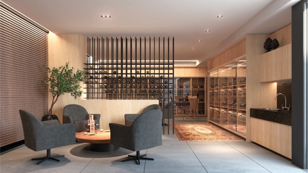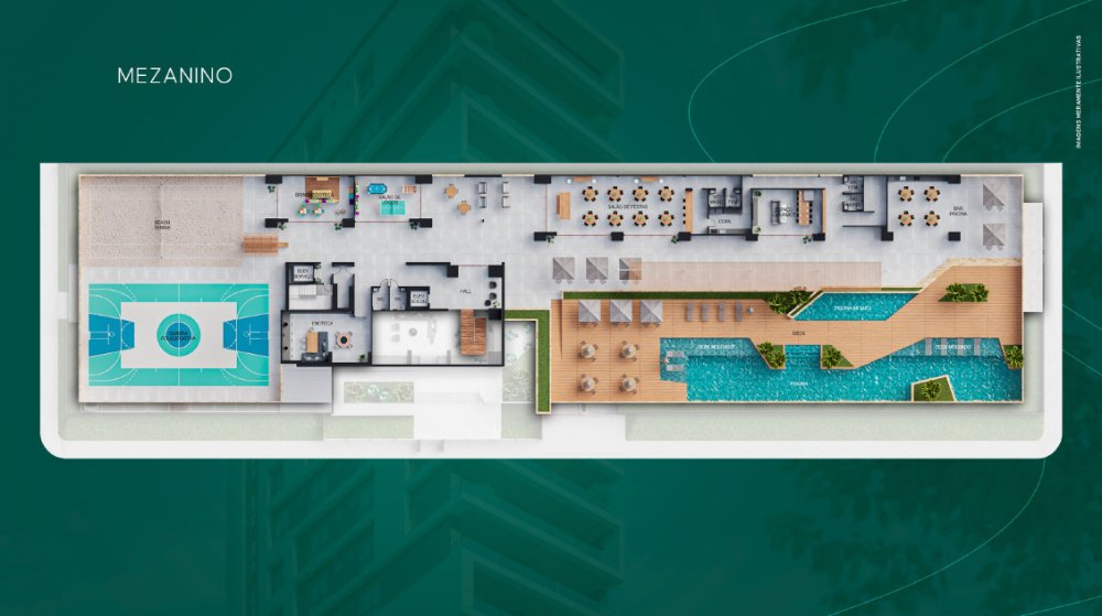 O pavimento Mezanino 01 é composto por Quadra poliesportiva, jardim, espaço Kids, sala de jogos, elevador de emergência, antecâmara, escada de acesso ao Mezanino 02 e ao térreo, 02 escadas de acesso ao pavimento térreo, 02 WC pcd, elevador social, hall social, enoteca, salão de festas, copa, espaço gourmet, 02 WC pcd masculino, 02 WC pcd feminino, deck, deck molhado, piscina adultos, piscina infantil, e bar de piscina.