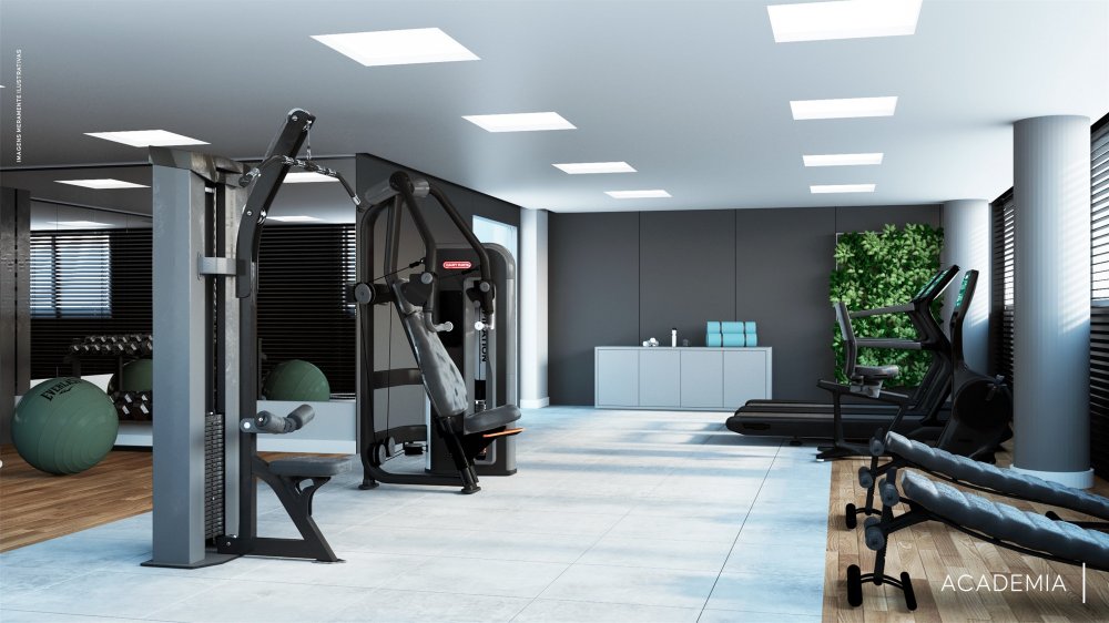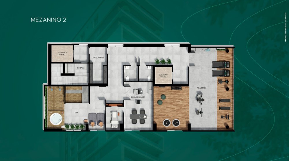 O pavimento Mezanino 02 é composto por elevador de emergência, antecâmara, escada de acesso ao pavimento Mezanino 01, e ao pavimento térreo, hall de serviço, sauna, spa, sala de massagem, WC pcd masculino, WC pcd feminino, espaço beleza, elevador social, hall social, e academia.
