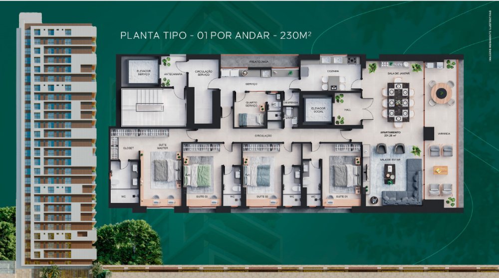 O apartamento 201 se localiza no 4º pavimento, acima do pavimento Mezanino 02, e é composto por área técnica, área de serviço, cozinha, quarto de serviço, WC. Serviço, despensa, lavabo, sala de estar/jantar, varanda, circulação, três suítes, um suíte master, e 04 vagas de garagem, sendo duas confinadas no pavimento térreo.