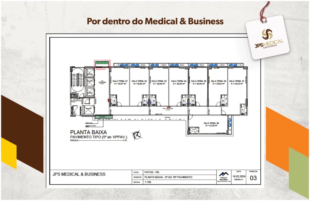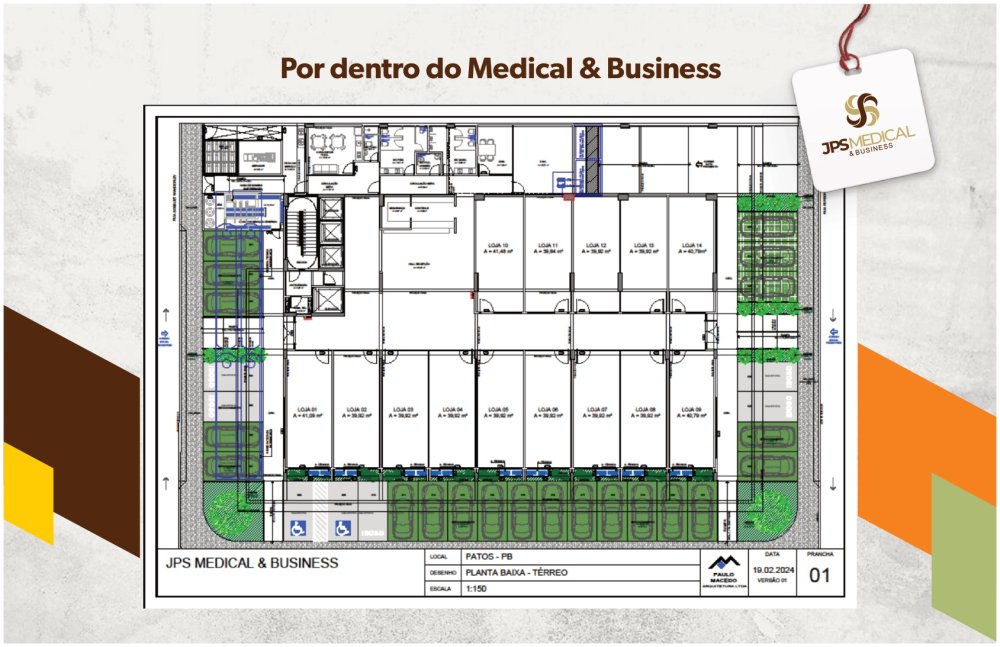 O JPS MEDICAL & BUSINESS se insere numa área de 1.747,90 m², é composto por 14 lojas comerciais e 119 unidades autônomas, possui 146 vagas de garagem rotativas, e distribui-se por 18 pavimentos da seguinte forma: